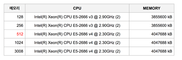 람다의 인프라는 전체 4GB 정도의 메모리를 갖고 있는데 3008MB까지 사용하지 못한다.