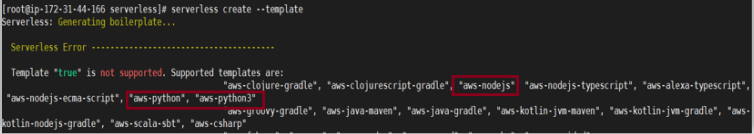 4) 파이썬 버전의 템플릿 설치 :  serverless create –template aws-python3