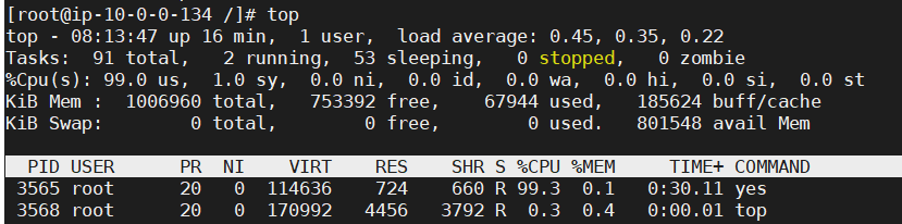 yes command에  cpu가 99%가 되도록 테스트 : yes >/dev/null