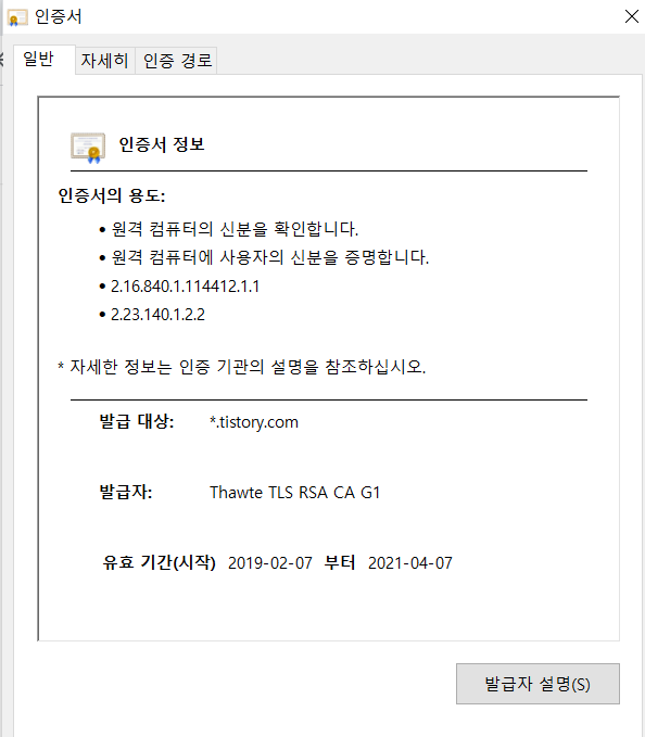 발급대상/발급자/유효기간 : 현재 발급대상의 발급자와 유효기간
