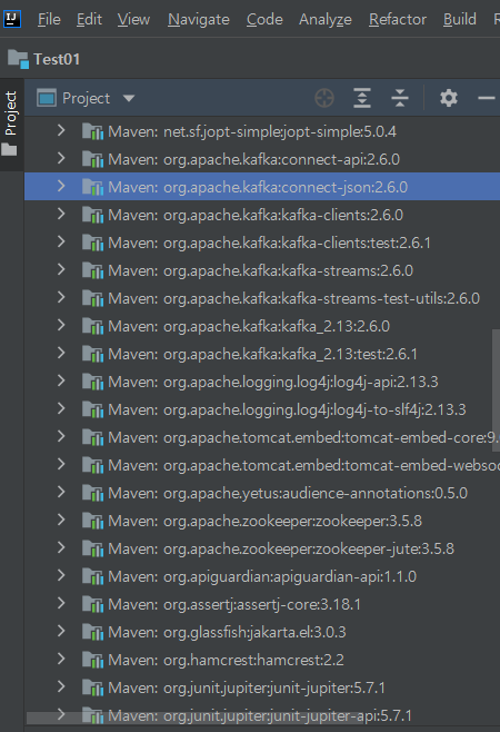 이제 프로트(kafkaproject)안의 모듈(Test01)안에 카프카 관련 라이브러리가 다 설치되면 준비완료