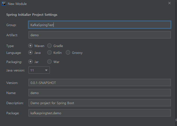 즉, 프로젝트 생성(kafakProject)-모듈추가(Group : KafkaSpringTest)-SDK 지정(java sdk)-spring boot환경지정