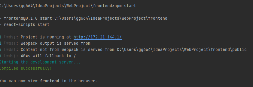 /frontend 경로에가서 npm start 명령어를 입력하면 바로 실행이 되며 리액트 초기화면이 나오면 성공!