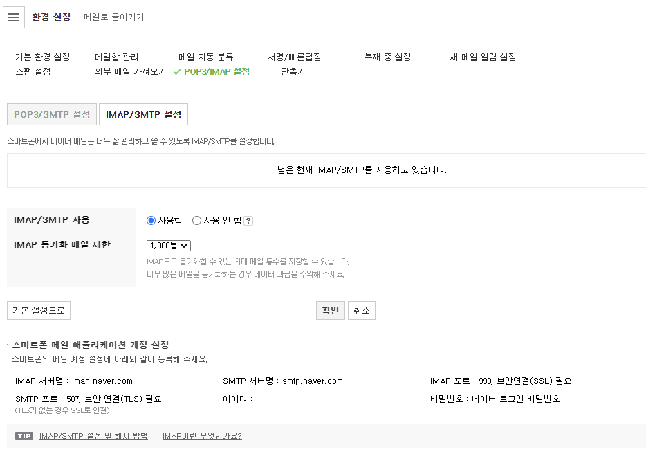 네이버메일의 환경설정에서 POP3/IMAP 설정을 확인할 수 있다.