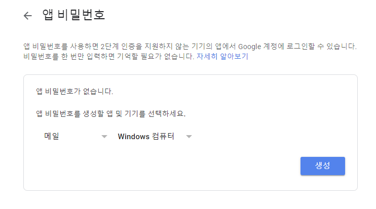 그래서 메일을 발송하는 구글 Gmail의 SMTP를 활성화 하기 위해서 아래와 같이 앱 비빌번호를 설정했다.
