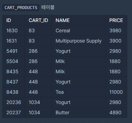 ID, CART_ID, NAME, PRICE는 각각 테이블의 아이디, 장바구니의 아이디, 상품 종류, 가격