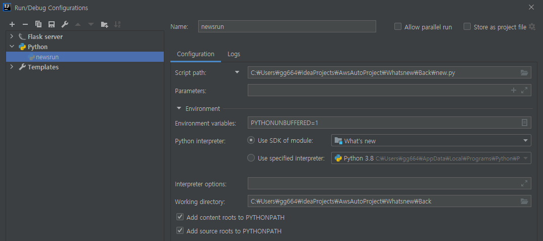 그중에서 flask를 선택하고, 새로운 config를 만들었다.