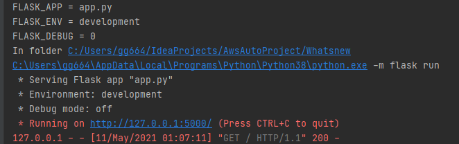 그리고 app.py를 시작하면 그러니까 flask config를 시작하면 confi에서 지정한대로 몇가지 로그가 보이고 실행이 된다.