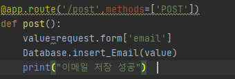 app.route('/post')를 추가해서 post메소드일때 reqeust.form['email']을 통해 받아았다