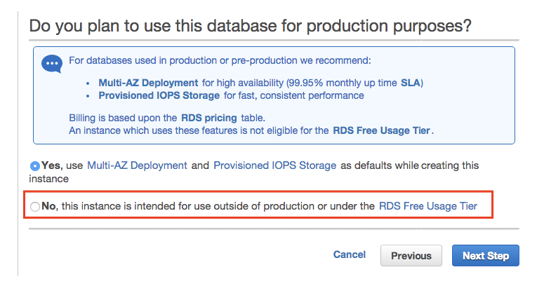 하지만, RDS생성시 Multi-AZ와 고성능 I/O인 Provisioned IOPS Storate를 사용하지 않도록 설정해야 합니다.
