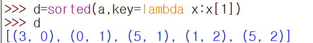 튜플의 두번쨰값 0,1,1,2,2, 순서대로 정렬이 되었다.