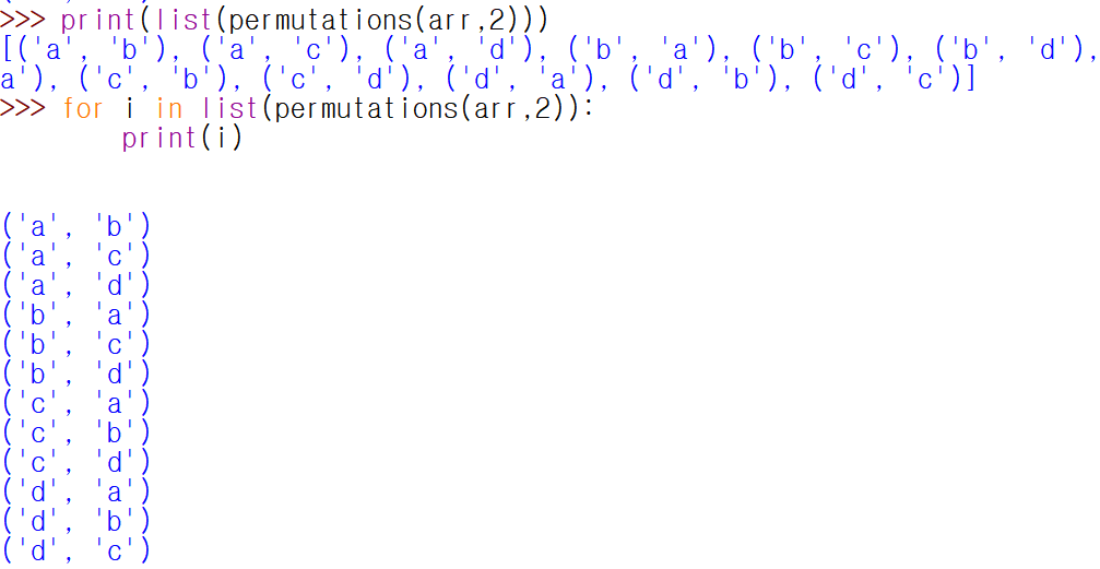 permutations(객체, r) 자체가 객체가 된다. 그래서 반복문으로 print할때 각 쌍들을 튜플형식으로 가지고 있음
