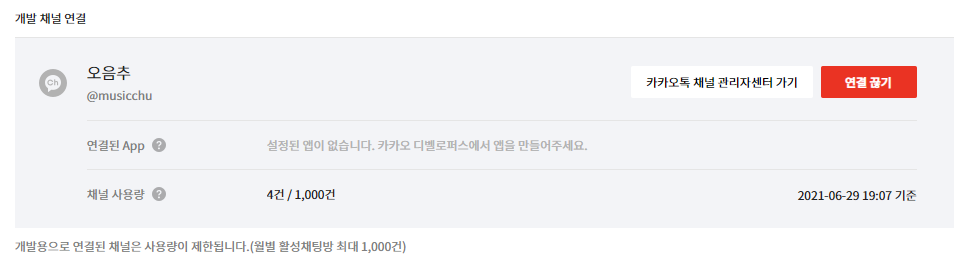 마지막으로 이렇게 기획한 챗봇을 카카오톡에서 사용하기 위한 채널이 필요하다.