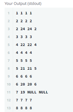 그러니까 x컬럼의 값이 y컬럼에도 있고,y컬럼의 값이 x컬럼에 있는 row를 찾는 것이다. 예를 들어 (20,2)이 출력된 이유는 1번쨰row와 2번쨰row를 통해 알 수 있다.(20,21)이 출력된 이유는 3번째row와 6번쨰 row를 통해 알 수 있다. (22,23)이 출력된 이유는 4번쨰row와 5번쨰 row를 통해 알 수 있다.