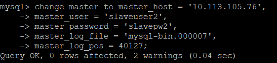 master_log_file과 master_Log_pos는 앞서 show master staus;에서 확인한 내용입니다.