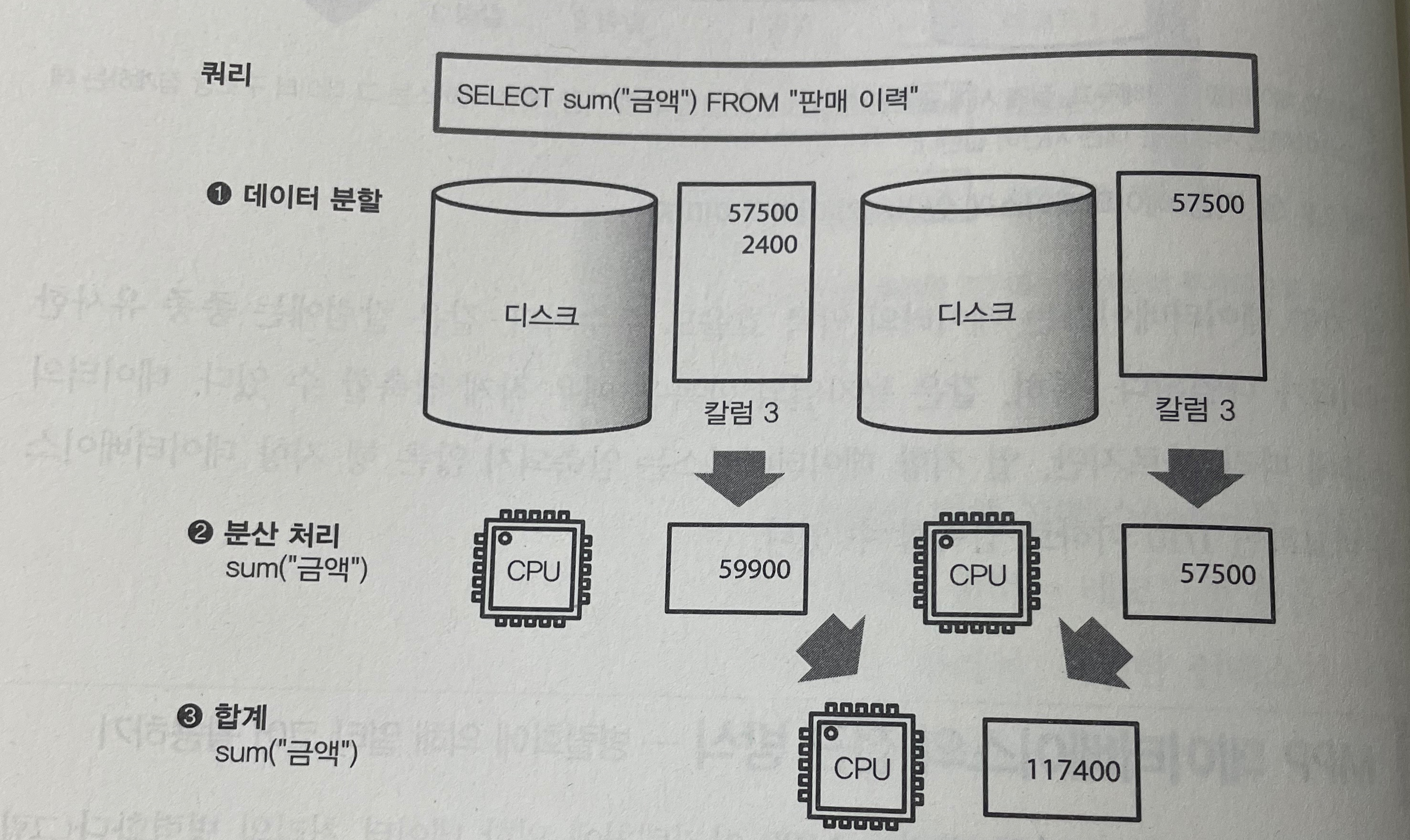 MPP데이터베이스에서는 여러디스크에 분산된 데이터가 서로다른 CPU코어에 의해 읽혀 부분적인 쿼리실행.