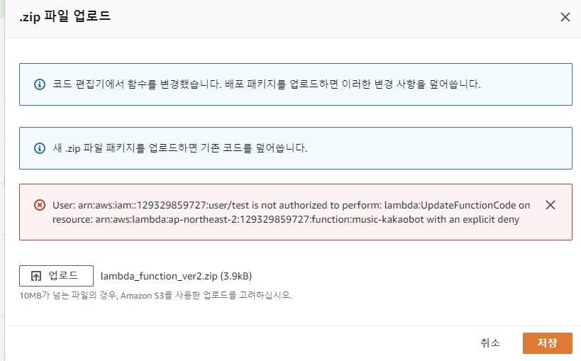 원인은 지금 내가 사용하고 있는 test라는 유저에게 UpdatelambdafunctionCode를 할 권한이 없는 것이다.