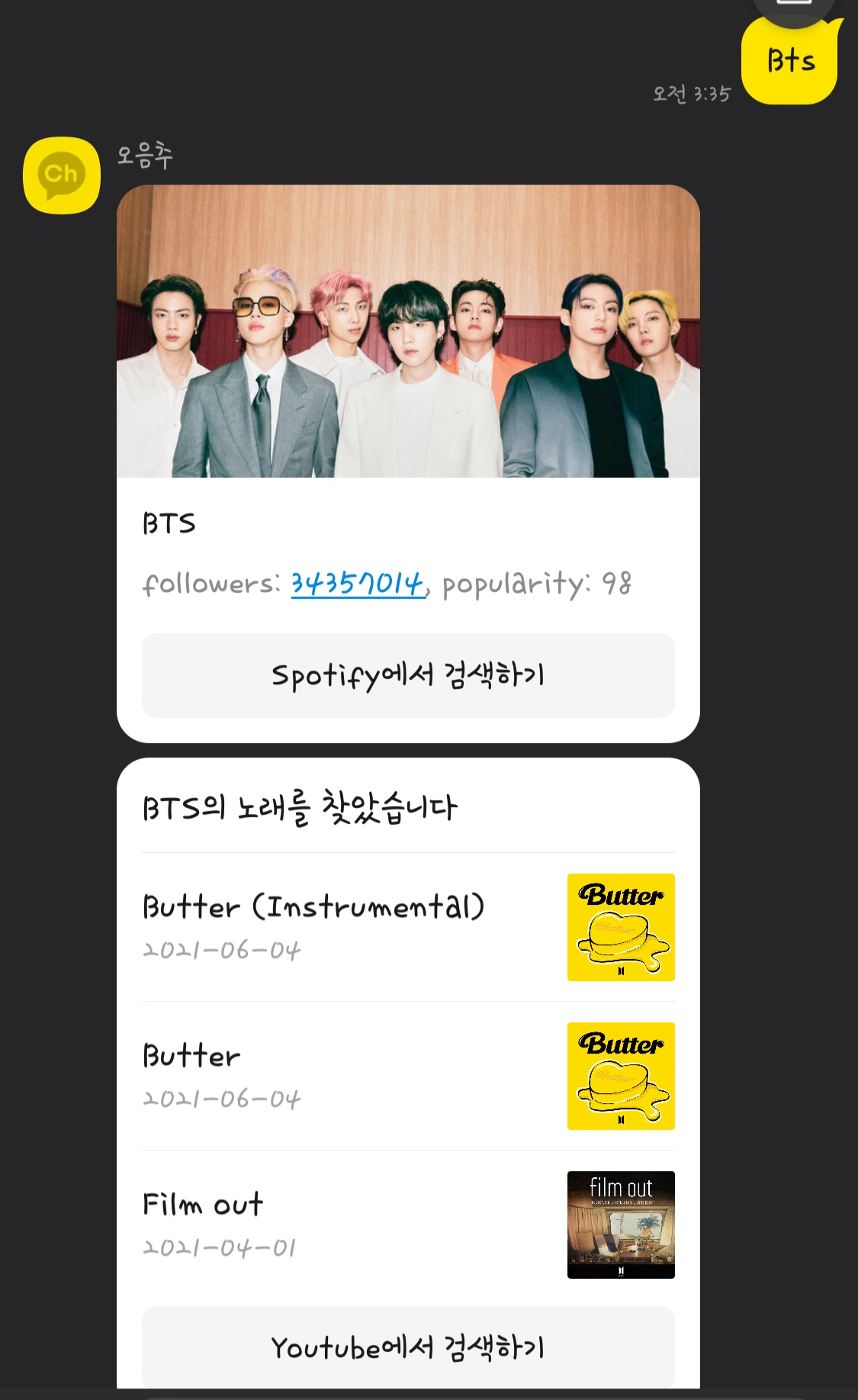반면 스포티파이에서 검색하는 아티스트명은 항상 BTS이다.