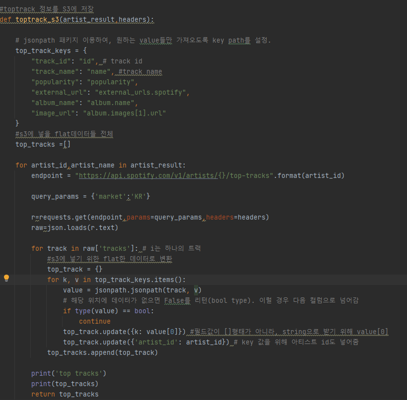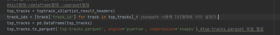 3) top_track 데이터와 마찬가지로 dataframe형태로 변형후, parquet형태로 떨굼 -> s3에 저장