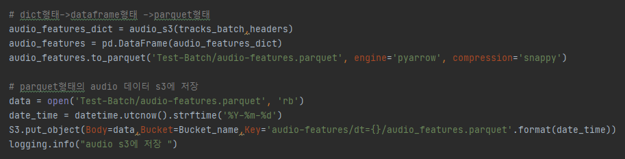 버킷의 경로가 audio-features/dt={}/audio_features.parquet 가 된다.