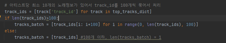 그러다보니 일일이 track_id에 대하여 api호출이 필요하게 되어 100개씩 쪼개서 수행하도록 했따.