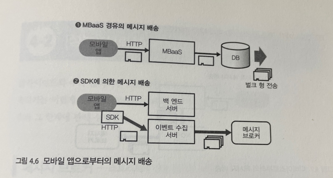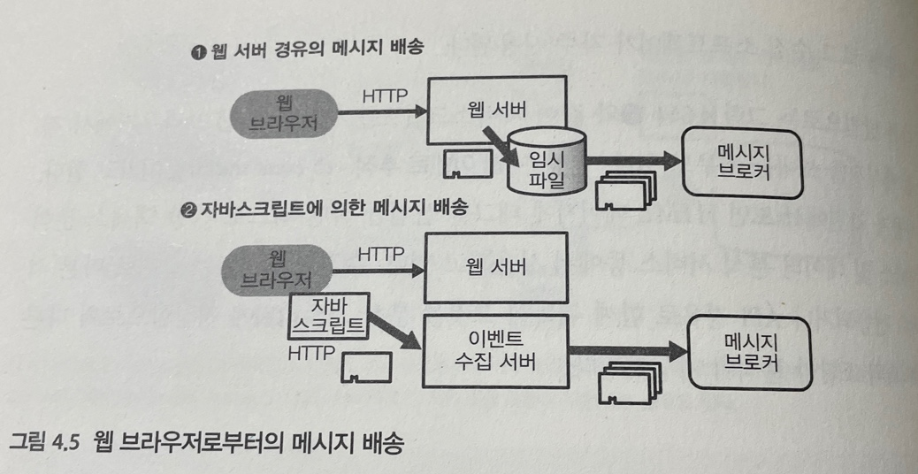 또는 분산스토리지에 직접 쓰는것이 아니라 메세지큐와 메세지 브로커등의 중계시스템에 전송할 수 있다.