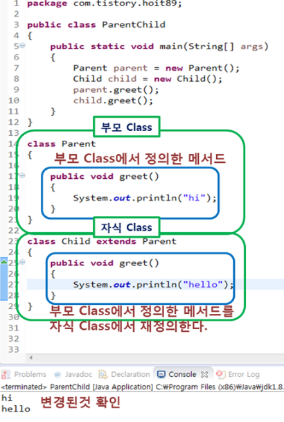 오버라이딩은 상속관계에서 부모클래스의 내용을 자식클래스에서 재정의 하는것입니다.