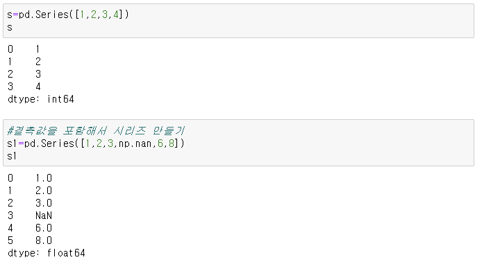 왼쪽결과는 일반적인 series를 정의한 경우이고, 오른쪽은 index를 직접 명시해서 정의한 경우이다.