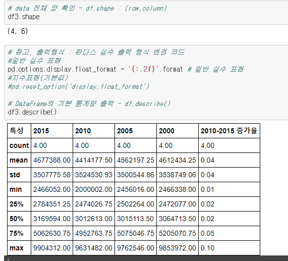 describe를 이용하면, 연산이 가능한 숫자를 가진 컬럼을 뽑아내고, 기본통계치 (count,mean,min,max 25%,90% 등) 확인