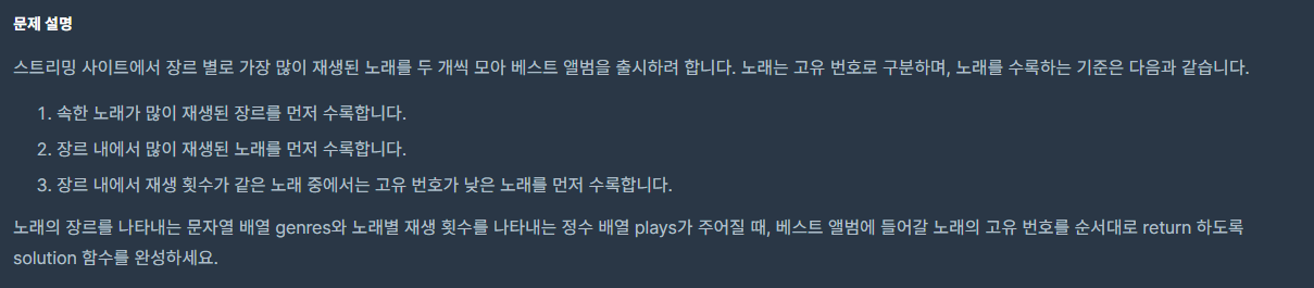 노래의 장르를 나타내는 문자열 배열 genres와 노래별 재생 횟수를 나타내는 정수 배열 plays가 주어질 때, 베스트 앨범에 들어갈 노래의 고유 번호를 순서대로 return 하도록 solution 함수를 완성하세요.