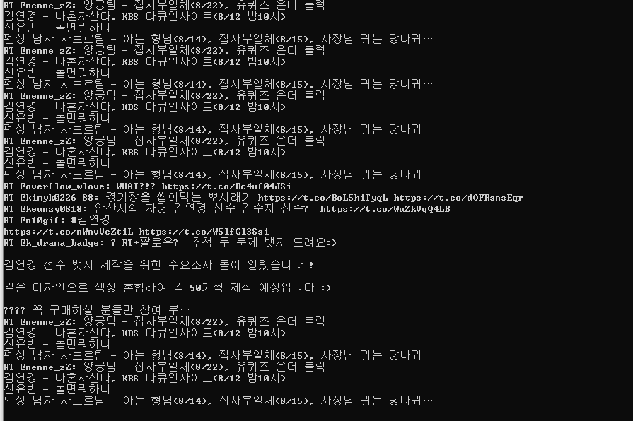 나는 트위터의 실시간데이터 중에서 '김연경'키워드를 가지고 필터링을 할 예정이다.
