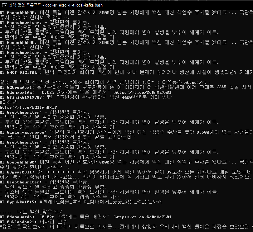 그리고 consumer에서 받는다. 받는형식을 따로 지정하지 않았더니 twitter['text']가 그대로 들어오는 것 같다.