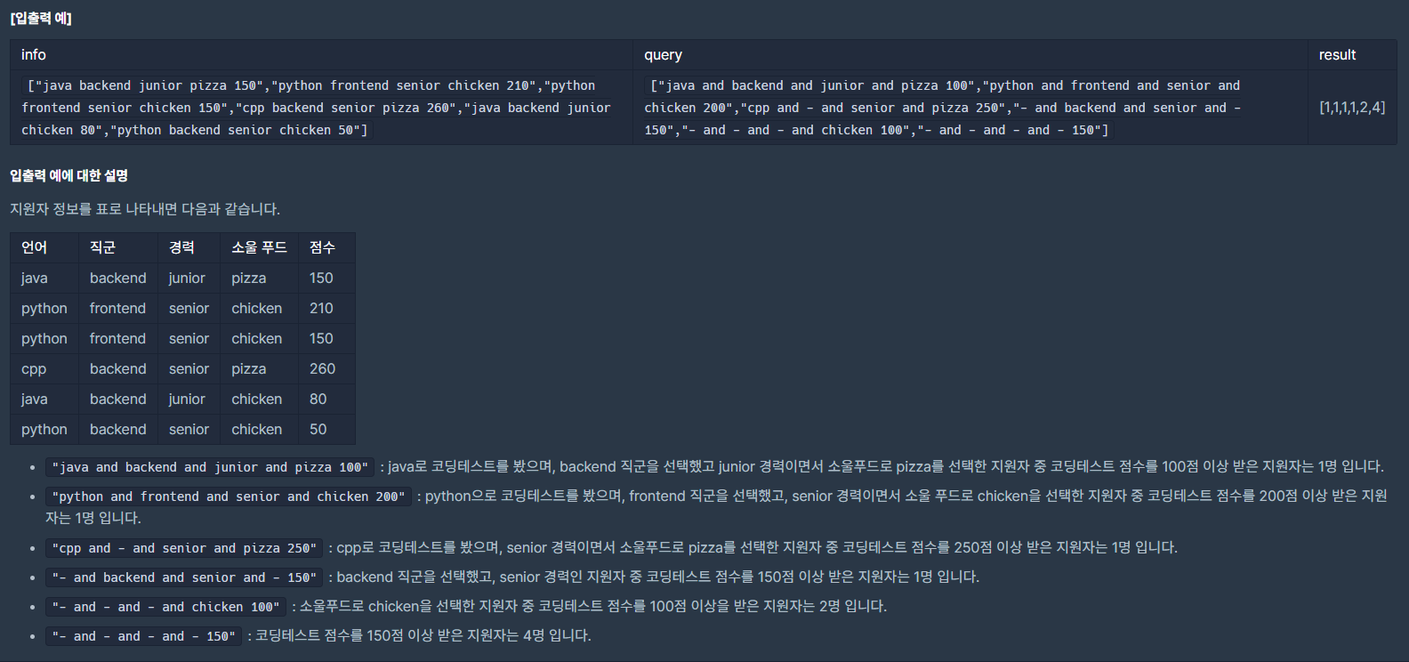 지원자가 지원서에 입력한 4가지의 정보와 획득한 코딩테스트 점수를 하나의 문자열로 구성한 값의 배열 info, 개발팀이 궁금해하는 문의조건이 문자열 형태로 담긴 배열 query가 매개변수로 주어질 때,