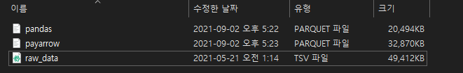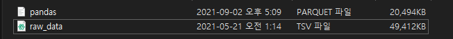 오 근데 신기하게 파일크기는 pandas에서 parqet파일로 변형했을떄가 더 작다...