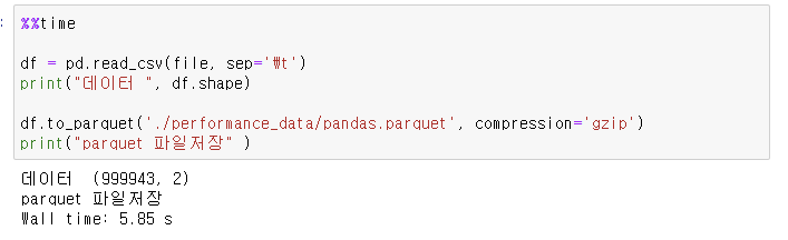 오 pandas로 읽어서 parquet로 저장하는것보다 훨씬 빠르긴하다!!