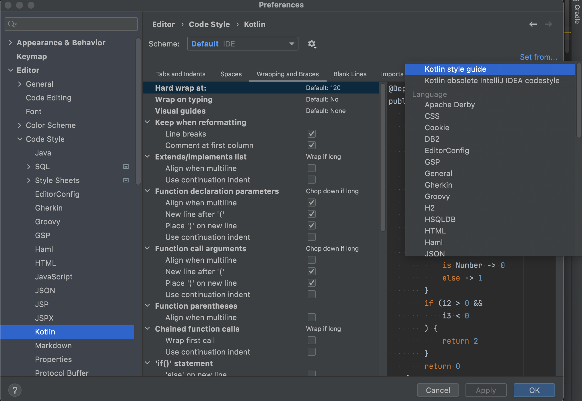 Preferences(단축키 : cmd + , ) > Editor > Coding Style > Kotlin > 오른쪽 상단에 Set form.. > Kotlin Style Guide 선택