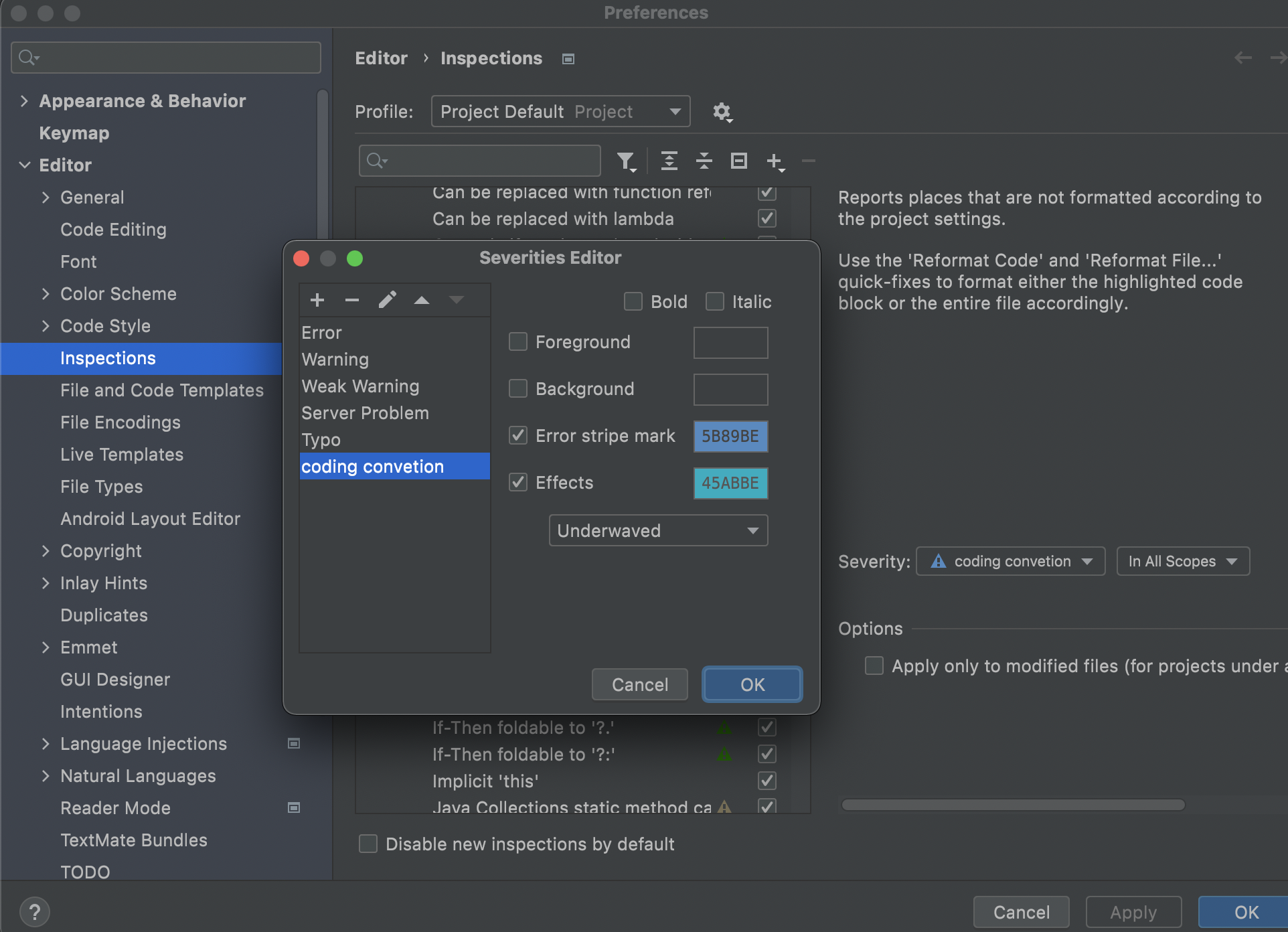 > File is not formatted according to project settings 체크선택 > 왼쪽에 serverity에서 원하는 경고레벨로 설정