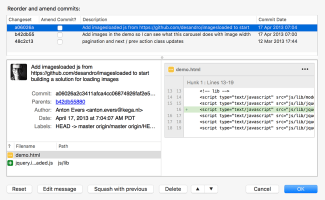 그리고 계속 sqush with previous를 눌러주면 최종적으로 3개의 커밋이 하나로 합쳐지는걸 볼 수 있다.