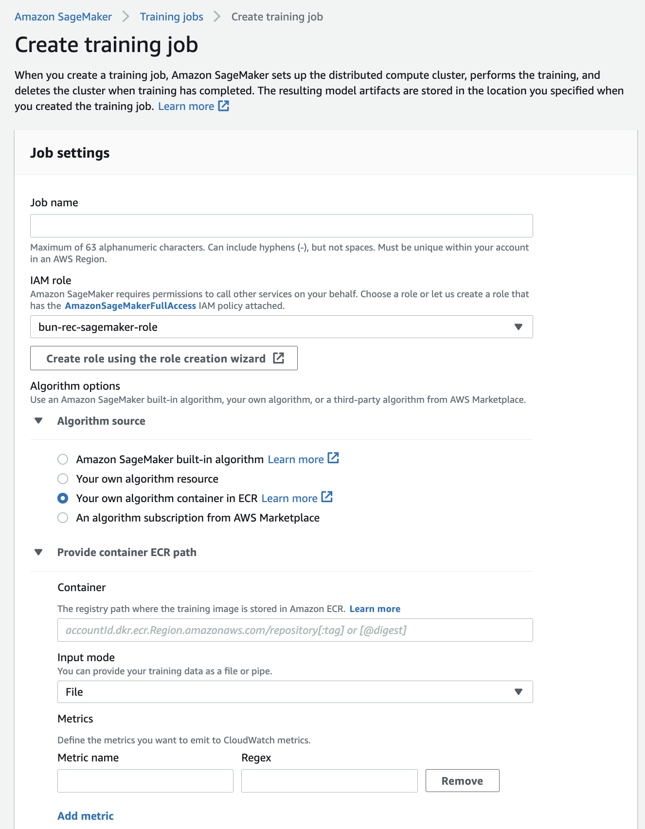 job setting:  자체개발한 알고리즘을 쓰기 때문에 그 알고리즘 소스를 가지고 오기기 위한 ecr경로가 필요하다.