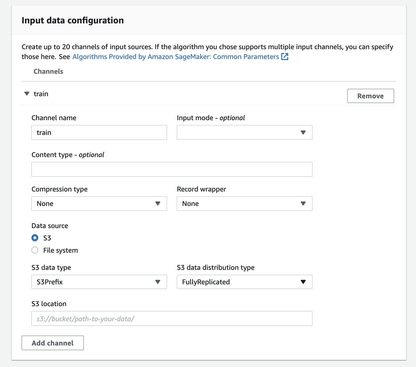 input data configuartion : train data를 넣을 s3경로, s3뿐만 아니라 직접 파일로 넣을수도 있다.