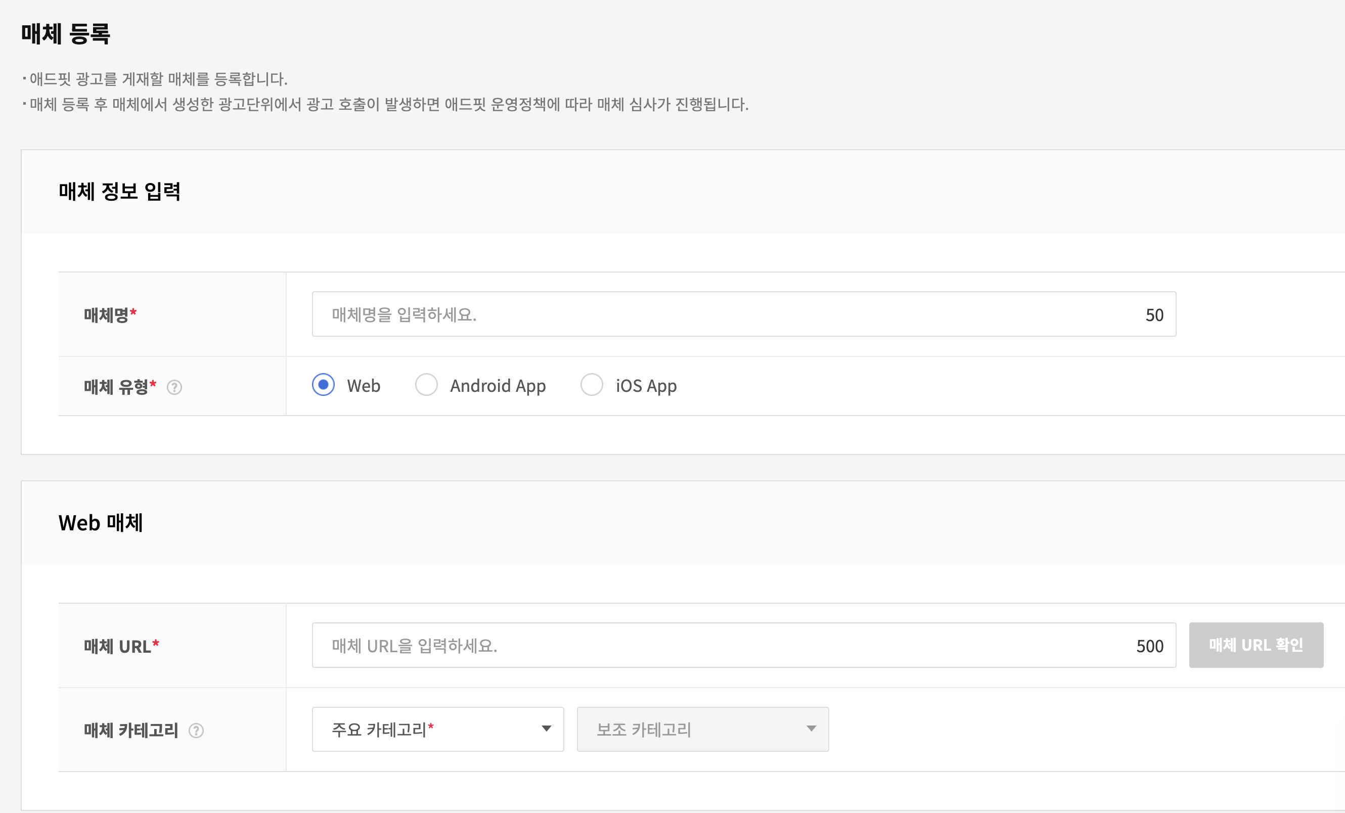 매체등록 URL에 배포한 서비스 주소를 등록하고, 카카오 애드핏 플랫폼의 심사과정을 대기한다.