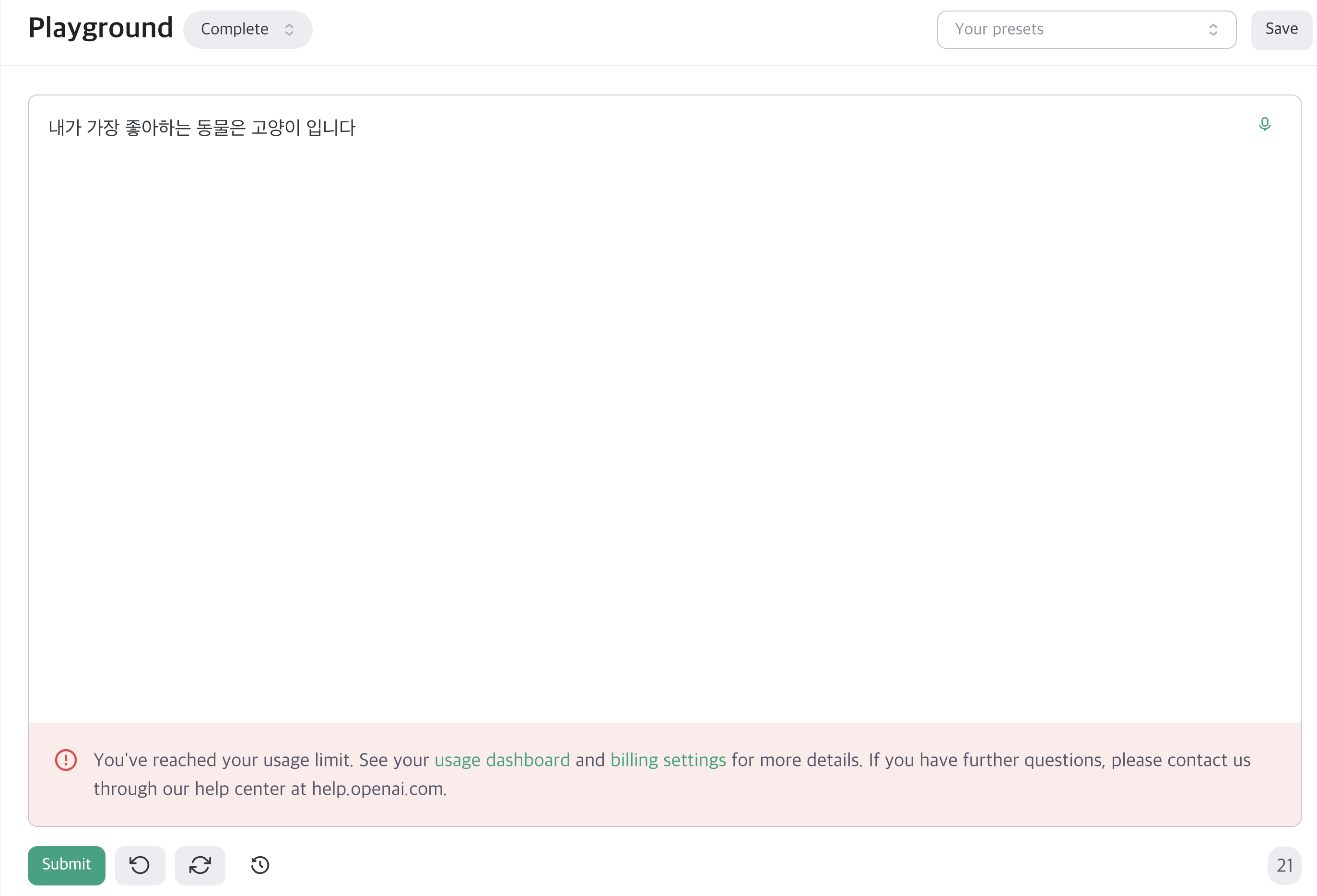OpenAI에서 제공하는 API 기능을 직접 체험해볼수 있는 웹기반 인터페이스