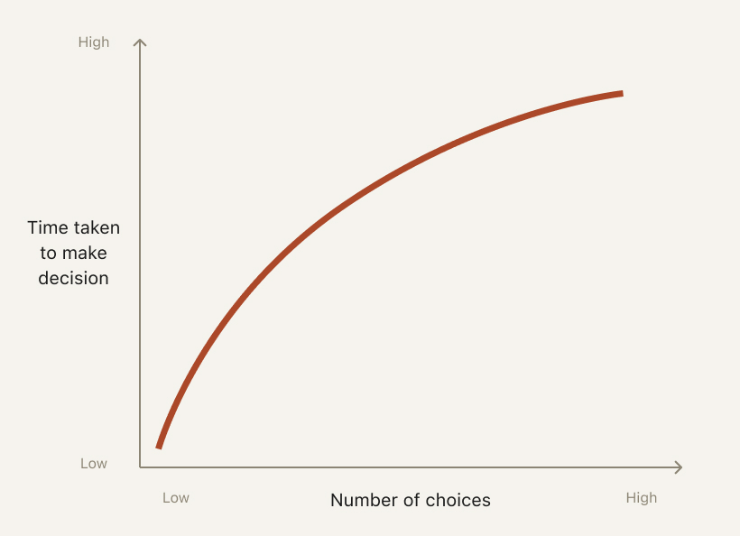 힉의 법칙은 선택지의 수와 결정을 내리는 데 필요한 시간 사이의 관계. 많은 선택지가 주어질수록 결정을 내리기 어렵다.