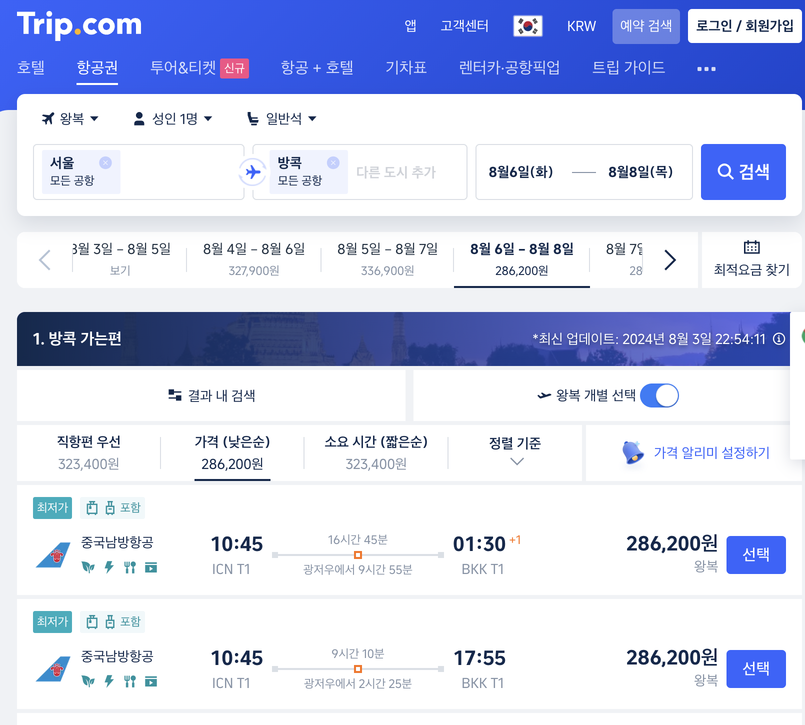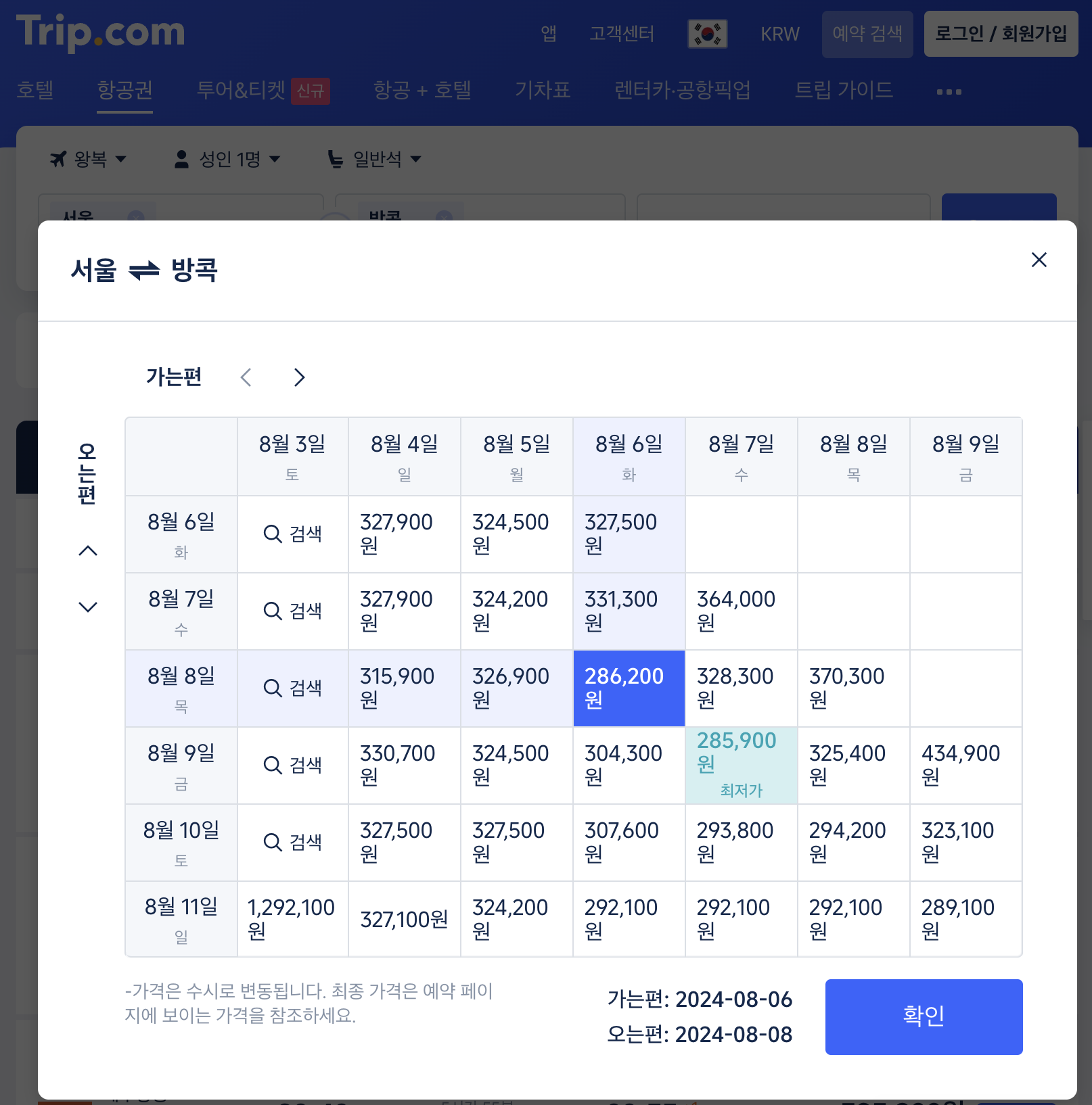 캘린더를 통해 확인한 최저가는 286,200원이지만,
