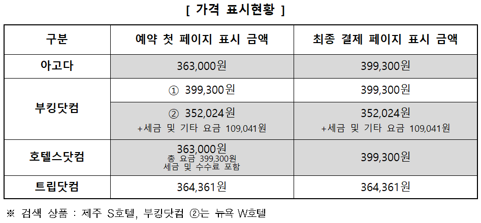 5개 업체중 4개 업체가 예약 첫 페이지에서 표시한 금액과 최종 결제 페이지에서 표시된 금액이 달랐다.