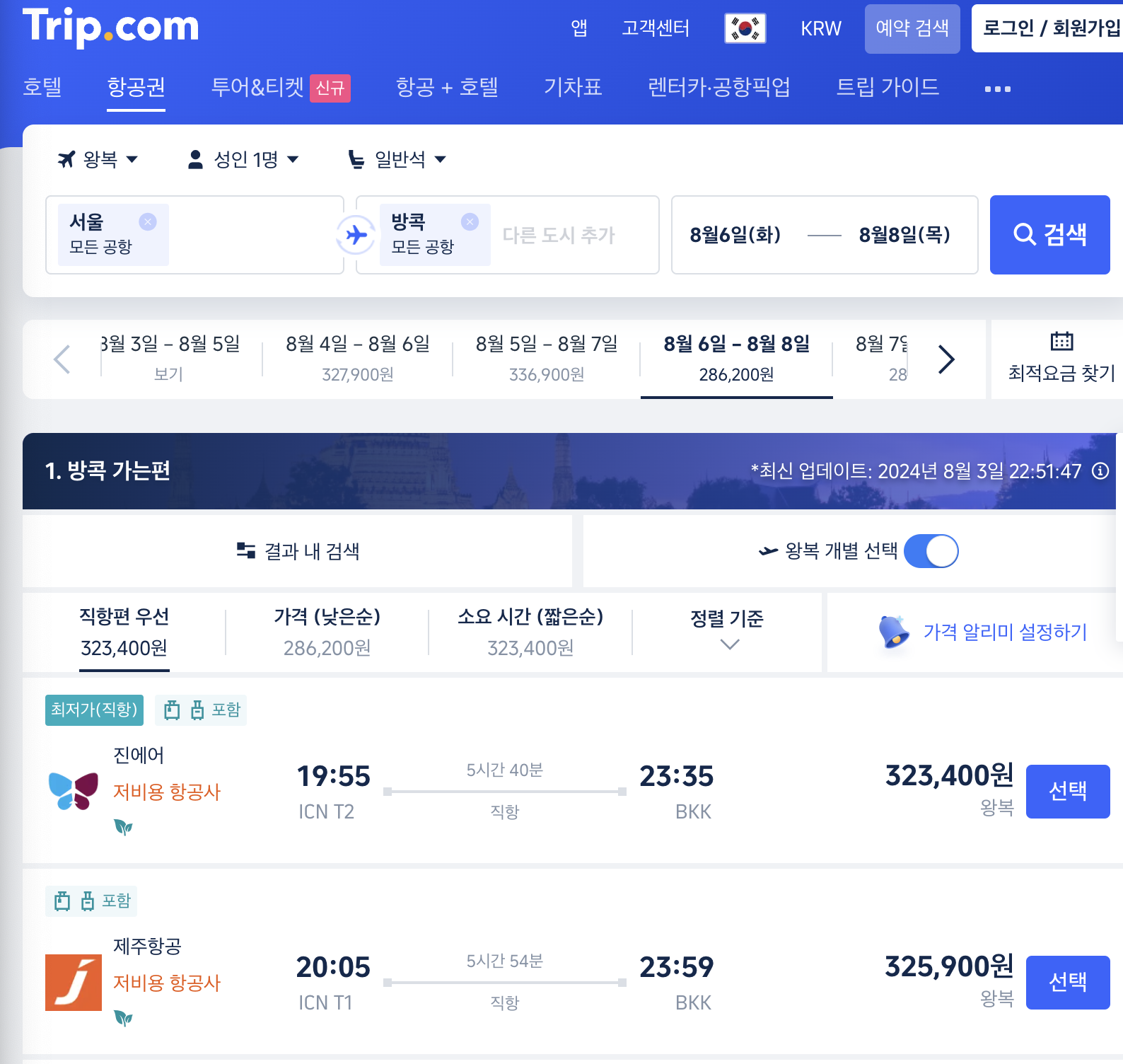 실제 항공가 최저가는 직항만 기준으로 하기 때문에 323,400원이다.