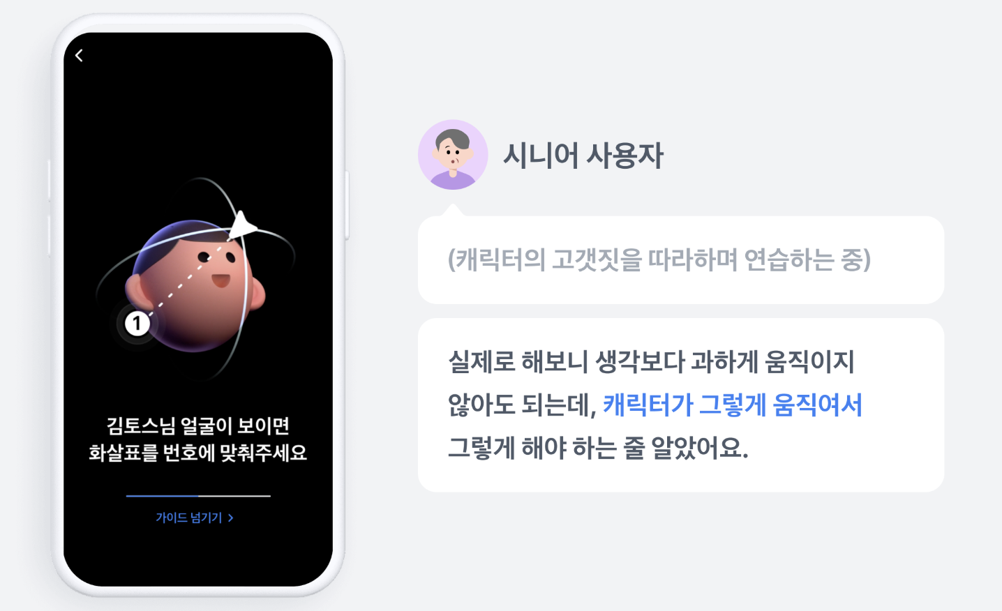 캐릭터를 100% 동일하게 따라해야만 태스크를 성공할수 있다고 생각해서 시니어 사용자는 고개를 좌우로 도리도리 돌리기만 했다.