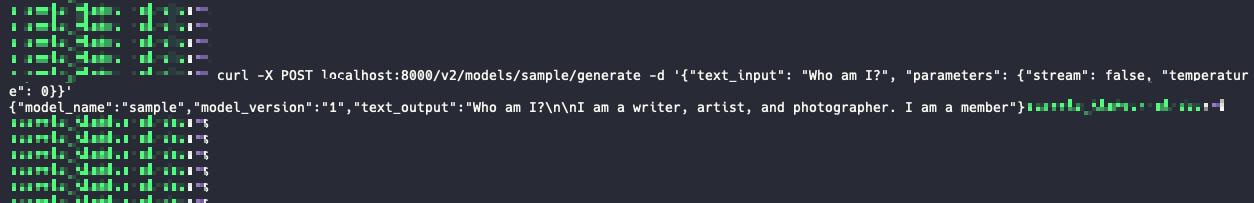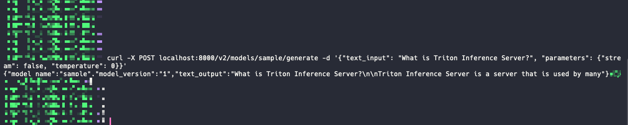 curl -X POST localhost:8000/v2/models/sample/generate -d '{"text_input": "What is Triton Inference Server?", "parameters": {"stream": false, "temperature": 0}}’