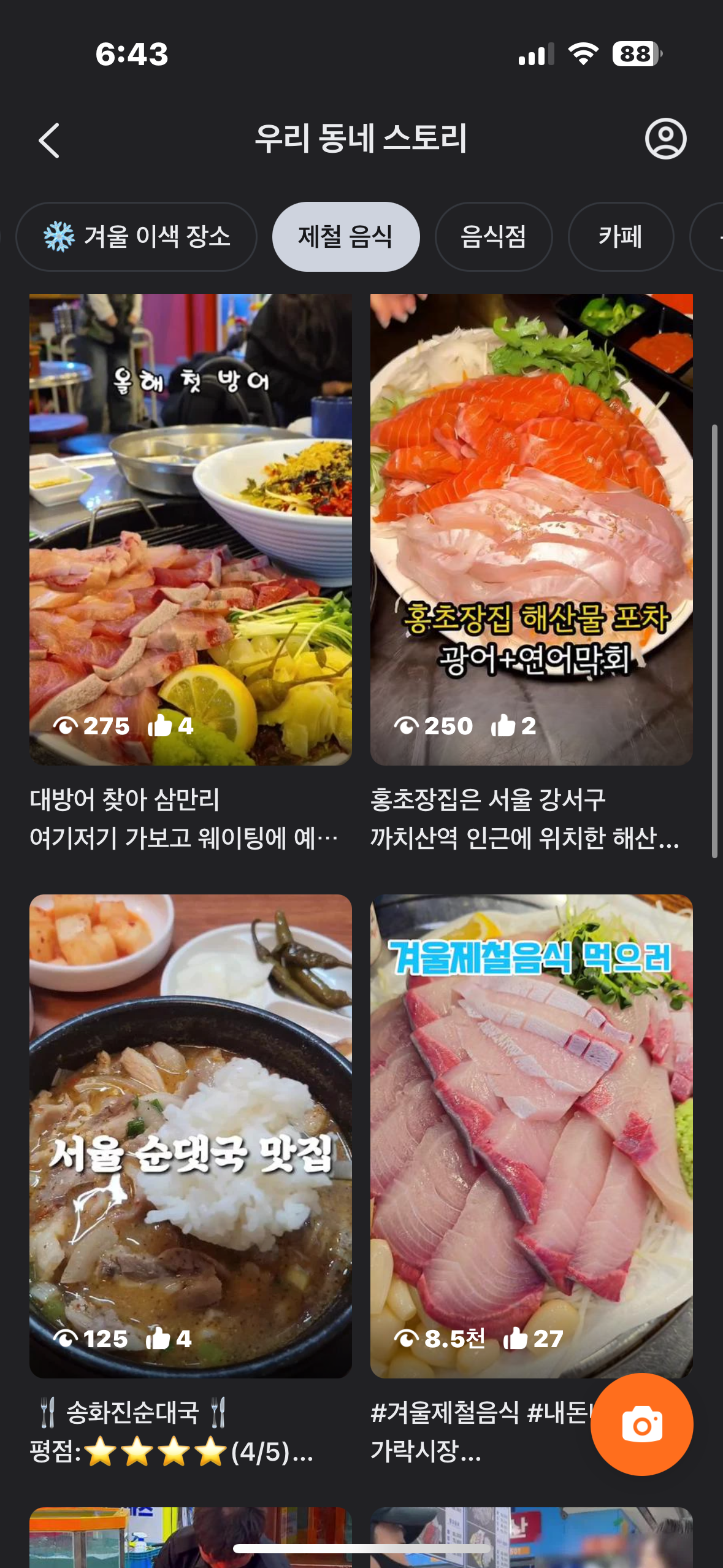 다음에 제철음식, 음식점, 카페, 운동 등 카테고리별 영상을 볼수가 있다.