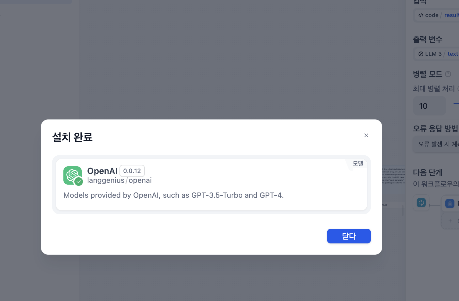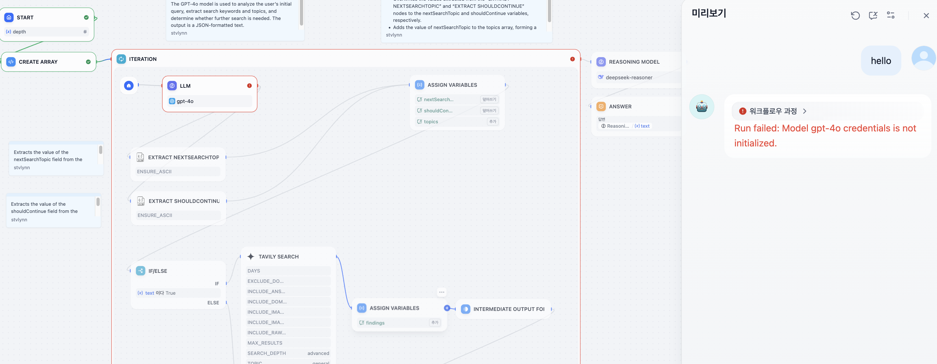 LLM, 지식검색, 답변 등 다양한 블록을 추가할수 있다.